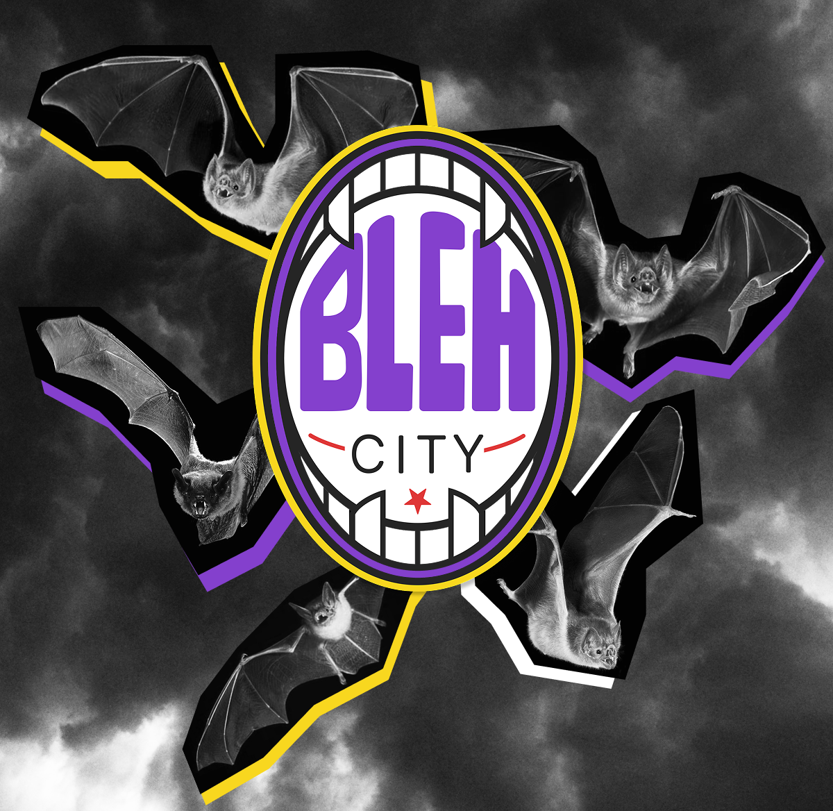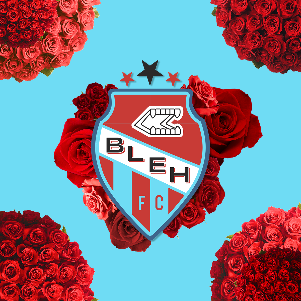 A romantic patchwork shield bisected with a bold BLEH, balances the enthralling crimson and baby blue club colors with a throwback vampire fang emblem.